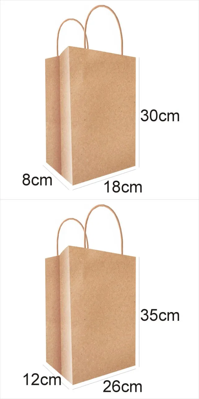 Size. 18cm/W x 8cm/L x 30cm/H /Close size Material. Kraft paper 210/gsm /Brown Finishing with Die-cutting, Kraft paper string and gluing.
